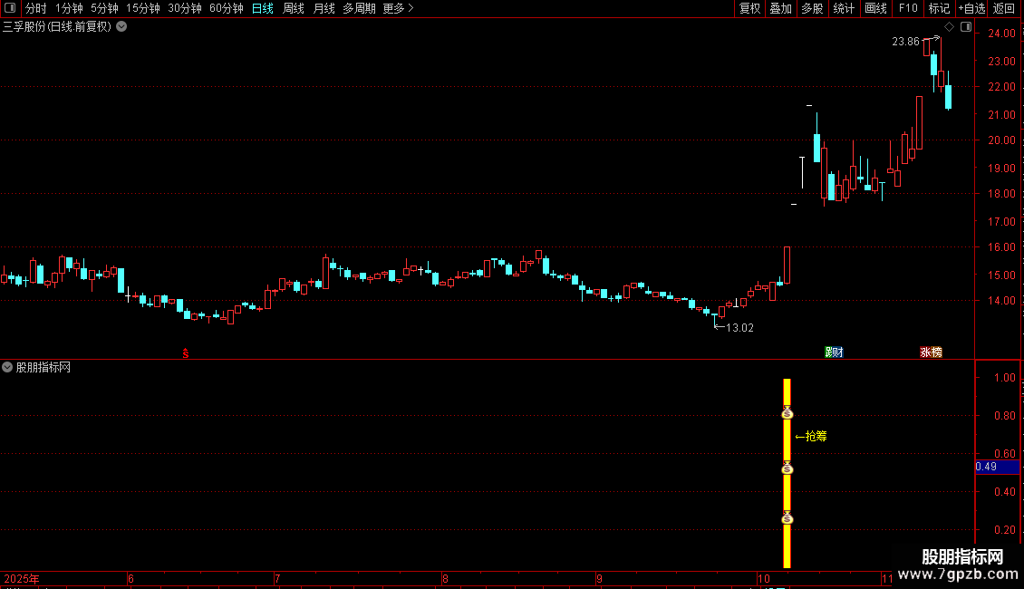 DRAWTEXT(ZBGS393,0.69,' ←抢筹'),COLORYELLOW;