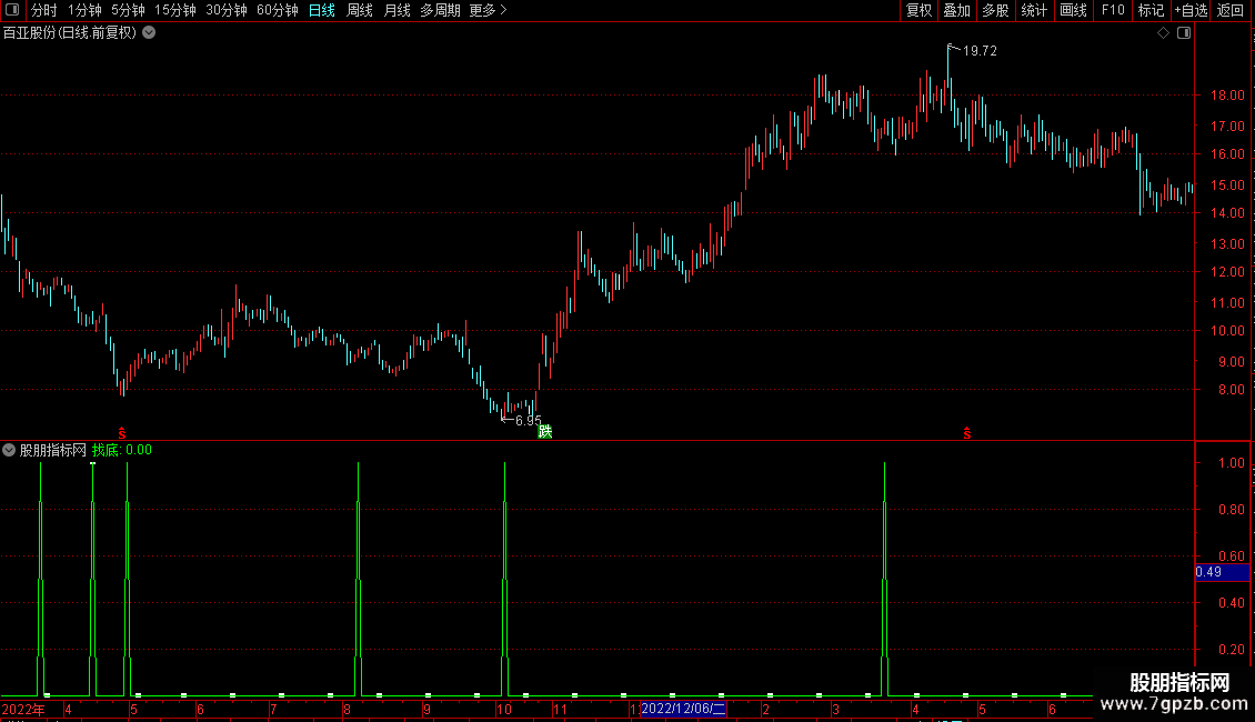 找底:RR AND NOT(REF(RR,1)) AND (RR1<-100 AND BB1<-100) AND CB1<-100,COLORGREEN;