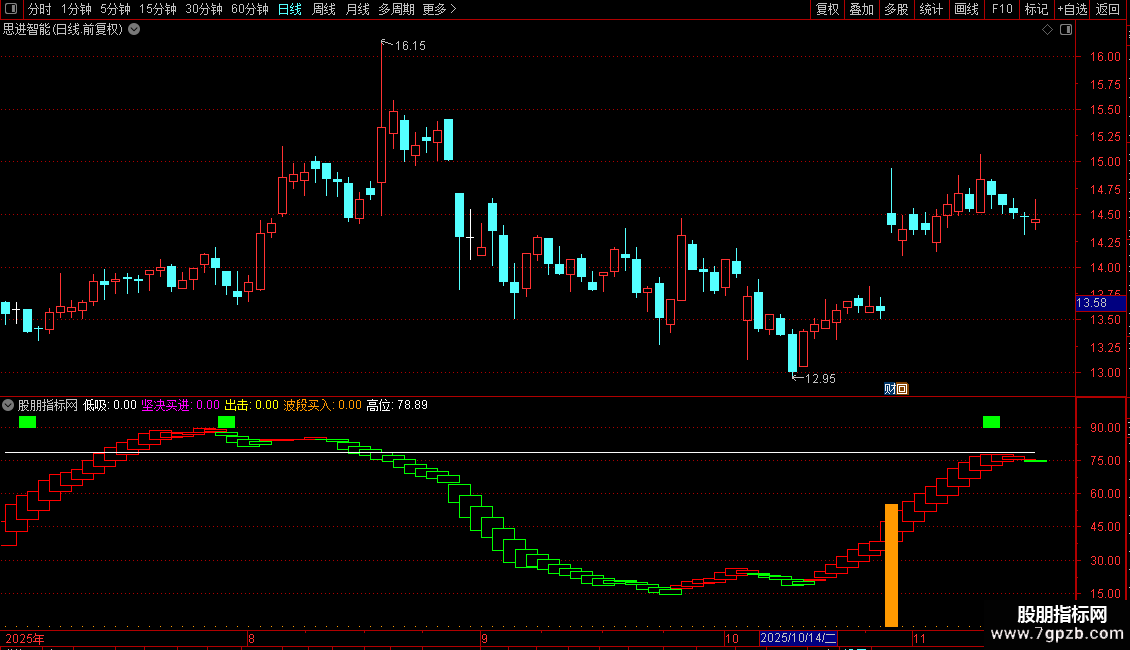 低吸:IF(CROSS(RSI,11),70,0),COLORWHITE,POINTDOT;