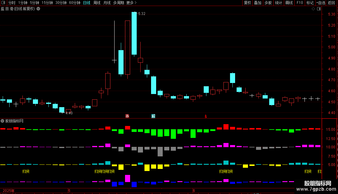 指标通过分析股价波动和成交量,计算不同时间周期内的资金流向变化,用柱状图直观展示多空力量对比。当短期(1天、3天、5天、10天)资金流向同时转为正值时,会显示“扫货”信号,提示可能的市场机会。