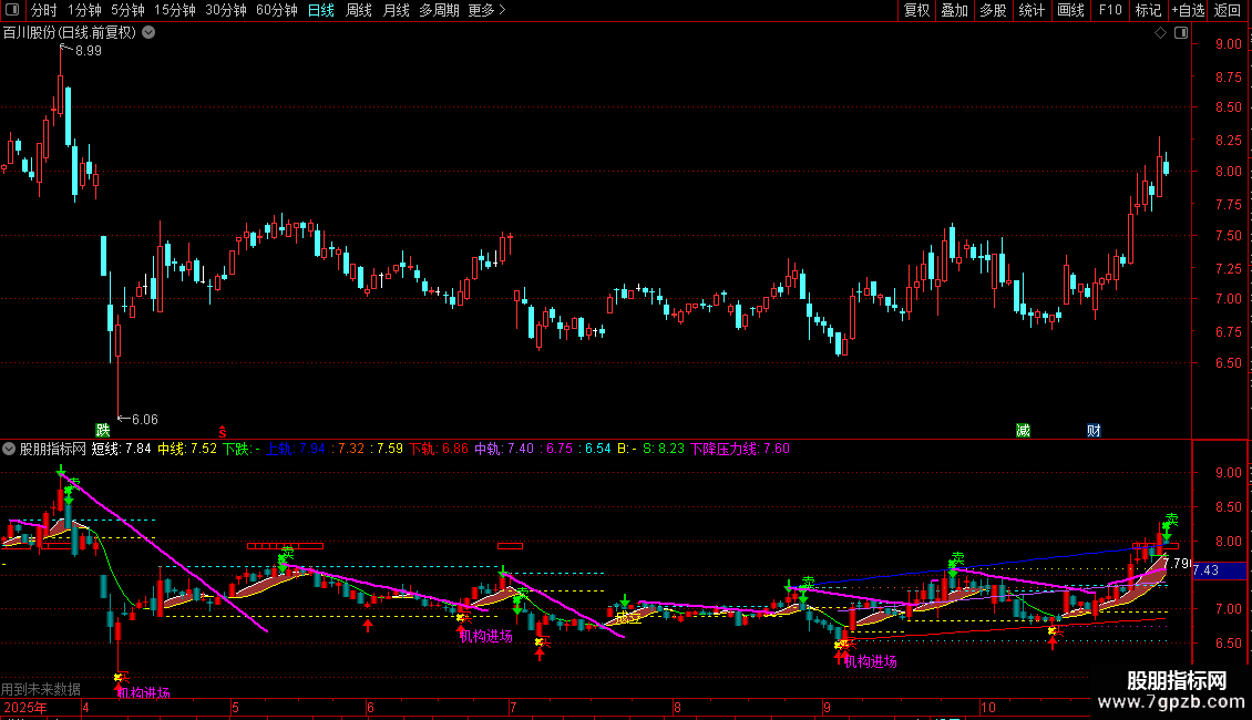 DRAWTEXT(VAR11 AND COUNT(VAR11,30)=1,LOW*0.95,'机构进场'),LINETHICK1,COLORFF00FF;