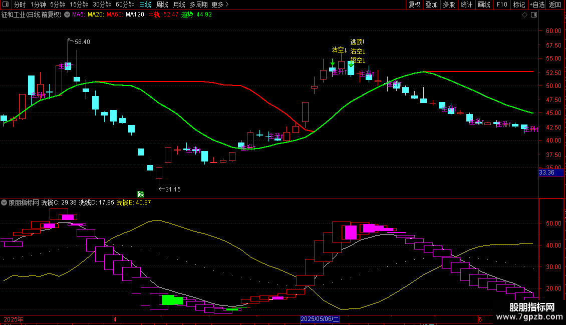 洗钱A赋值:(收盘价-32日内最低价的最低值)/(32日内最高价的最高值-32日内最低价的最低值)*1.2*收盘价