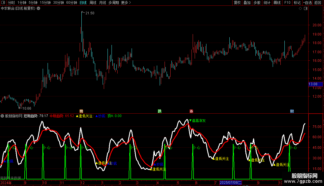 ▲逢低关注: DRAWTEXT(REF(CROSS(中期趋势,短期趋势),82) AND 中期趋势>1.3*短期趋势,短期趋势,'▲逢低关注'), COLOR00FFFF, LINETHICK1;