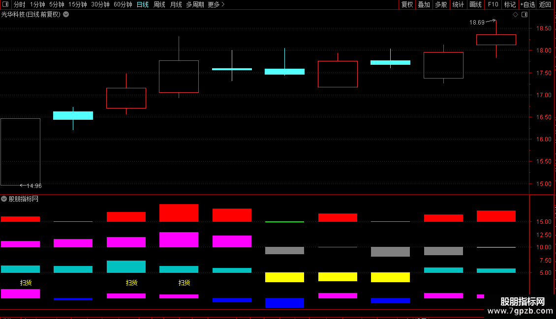 使用方法:在副图加载指标后,重点关注柱体颜色变化。短线看3日柱,中线看5日柱,长线看10日柱。"扫货"信号出现在四条柱体均为红色时,若股价处于低位或突破关键平台,可信度更高。柱体高度反映资金强度,持续红柱说明主力控盘力度大。建议结合MACD金叉、成交量放大等信号验证,避免在下降趋势中盲目跟进。适合捕捉中长期底部启动和突破回踩后的二次拉升机会。