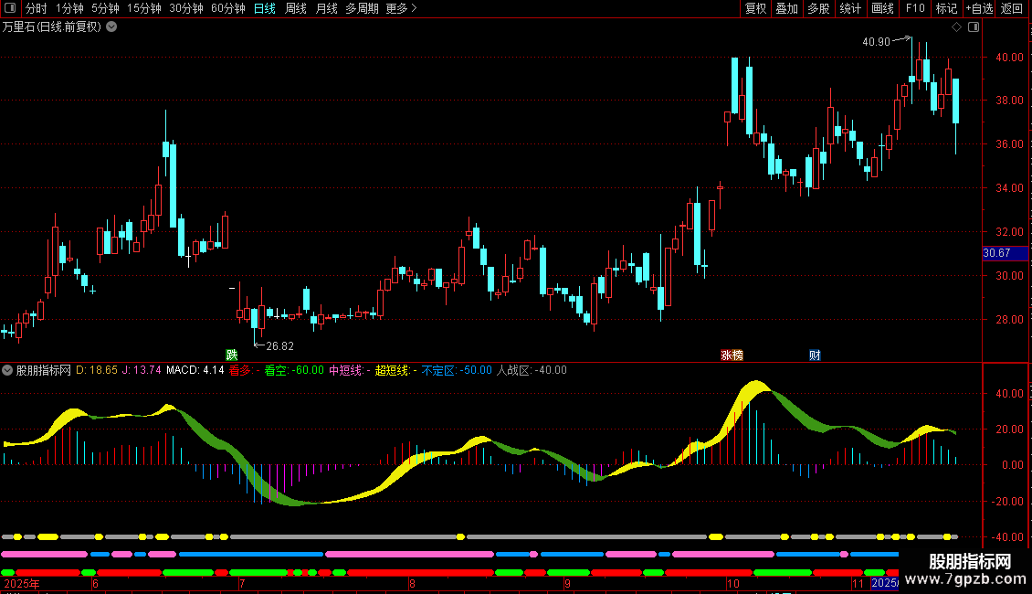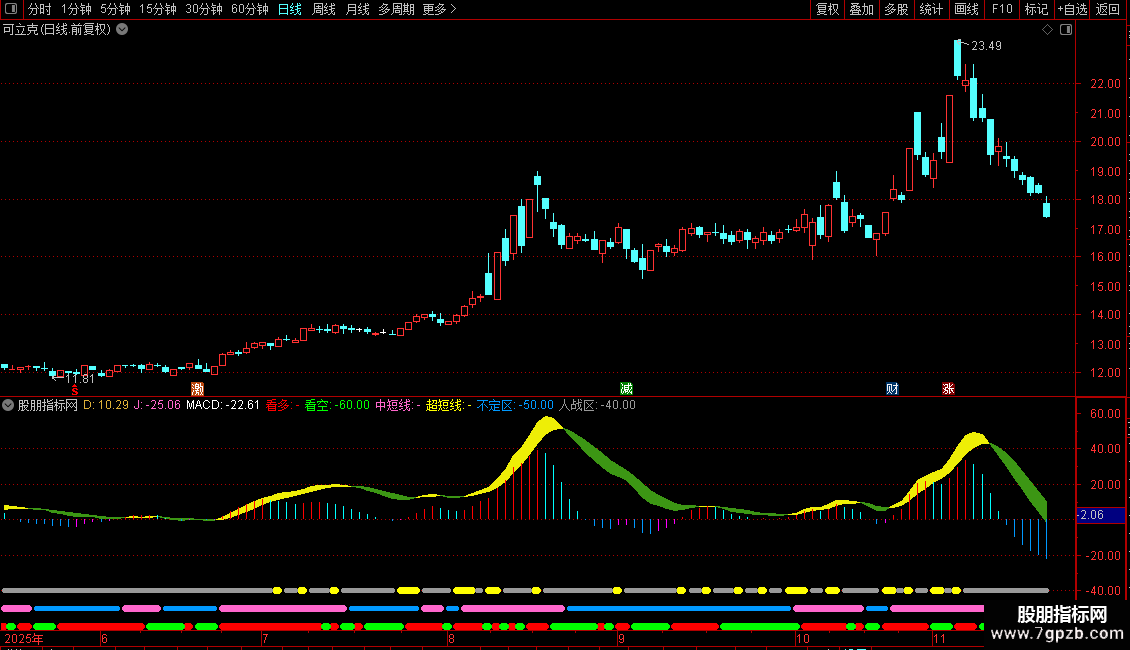 核心逻辑为:当J线上穿D线(粉紫线)且MACD红柱放大时,触发中短线看多信号;反之,绿柱扩大伴成交量萎缩则提示看空。