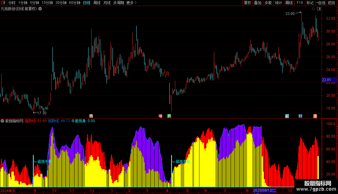 牛股现身:IF(CROSS(强势线,9),50,0),STICK,LINETHICK3,COLORFFFF00;