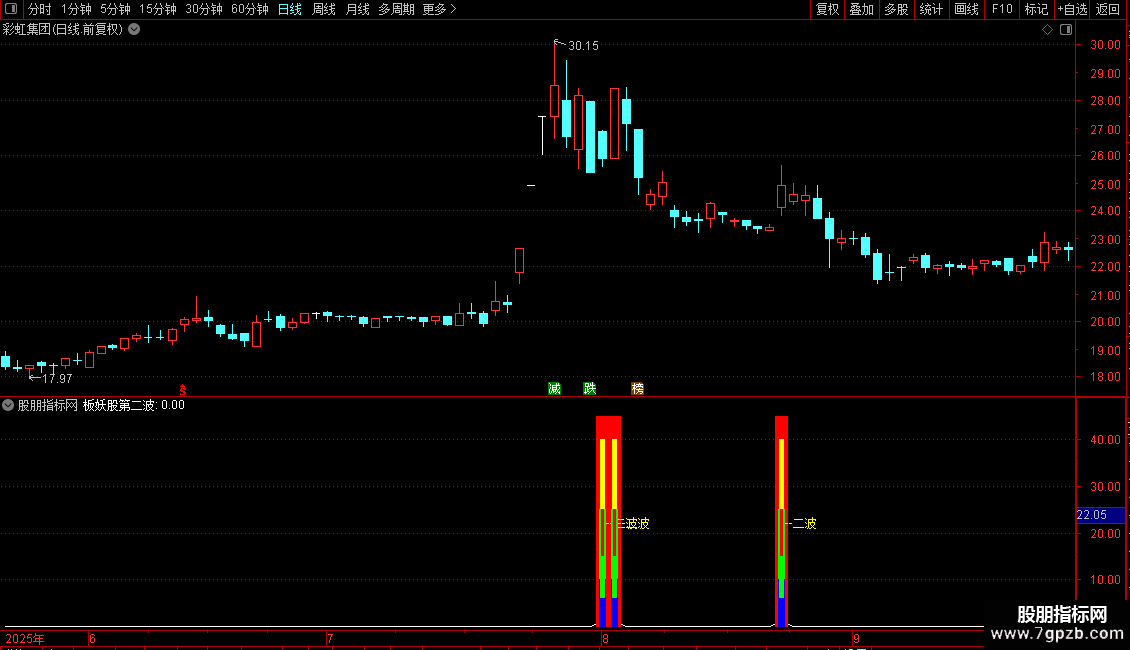 共振触发二波信号:上述条件同时满足时,标记为“板妖股第二波”——在图表上以多色柱与显眼文字提示(便于盘中快速识别)。