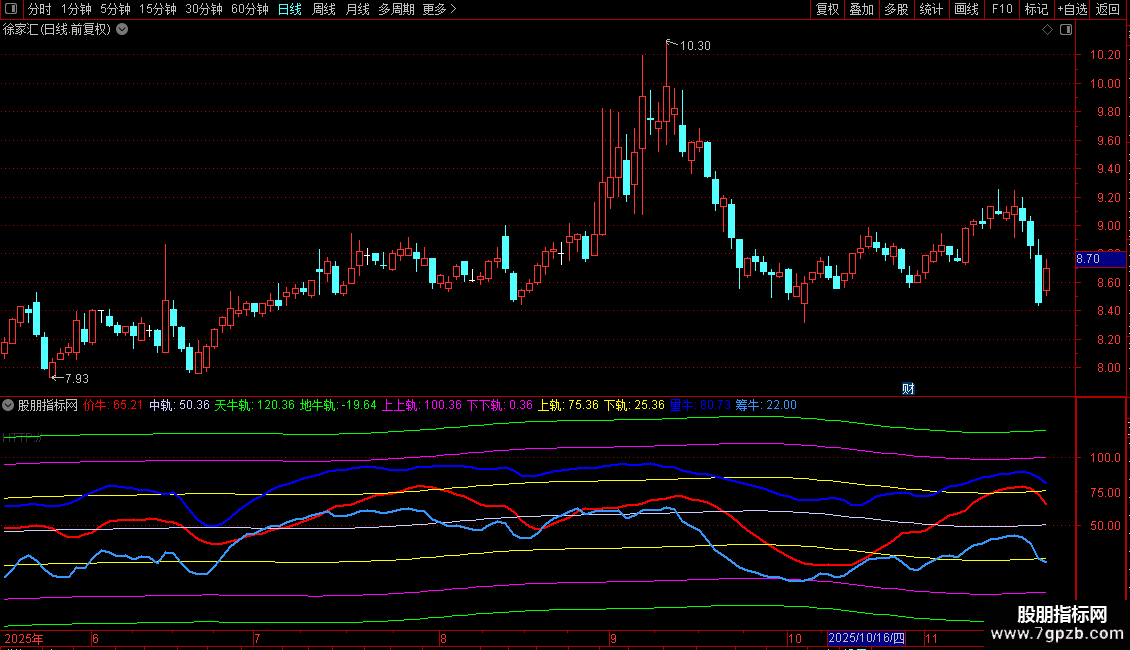 1. 彩线寻牛将量牛和价牛分别用彩色线表示,包含变化上下轨,彩线结合运用交叉形成彩线寻牛指标;