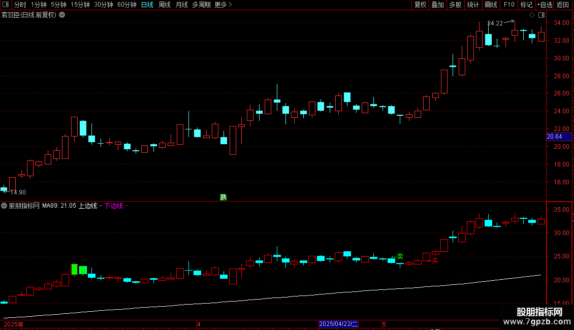 DRAWTEXT(CROSS(买线,卖线),LOW*1.00,'←买'),COLORRED,LINETHICK2;