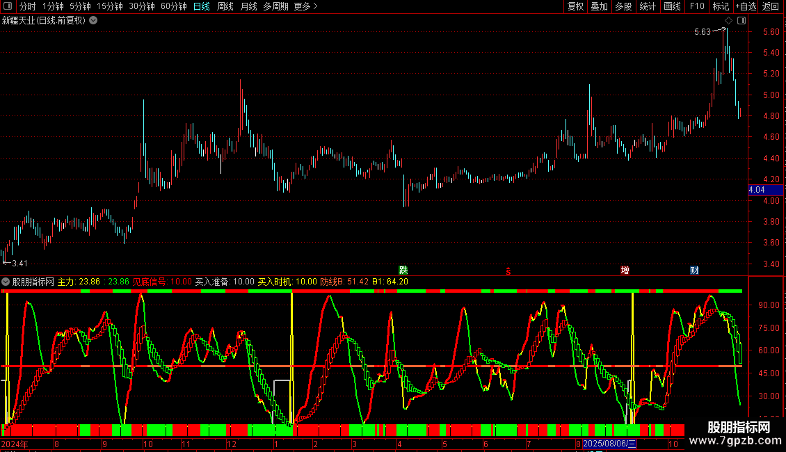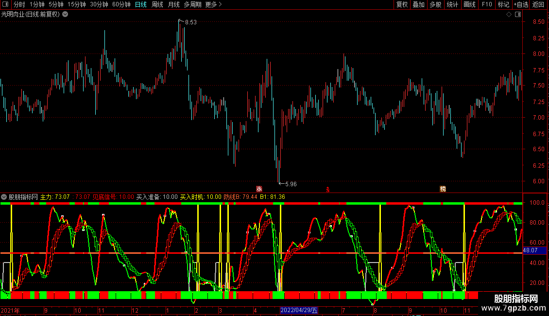 买入时机: IF(CROSS(主力,见底信号),100,10), LINETHICK2,COLORYELLOW;