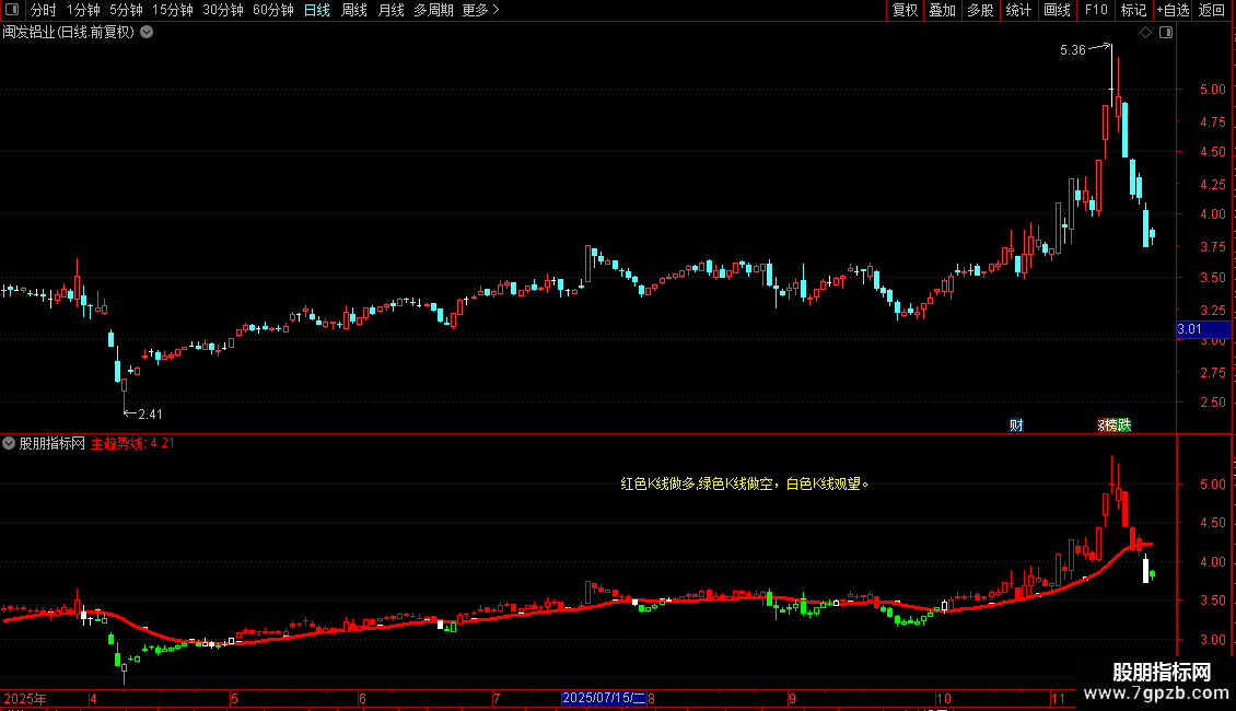 DRAWTEXT(C AND CURRBARSCOUNT=80 ,AAA, '红色K线做多,绿色K线做空,白色K线观望。 '),COLORYELLOW;