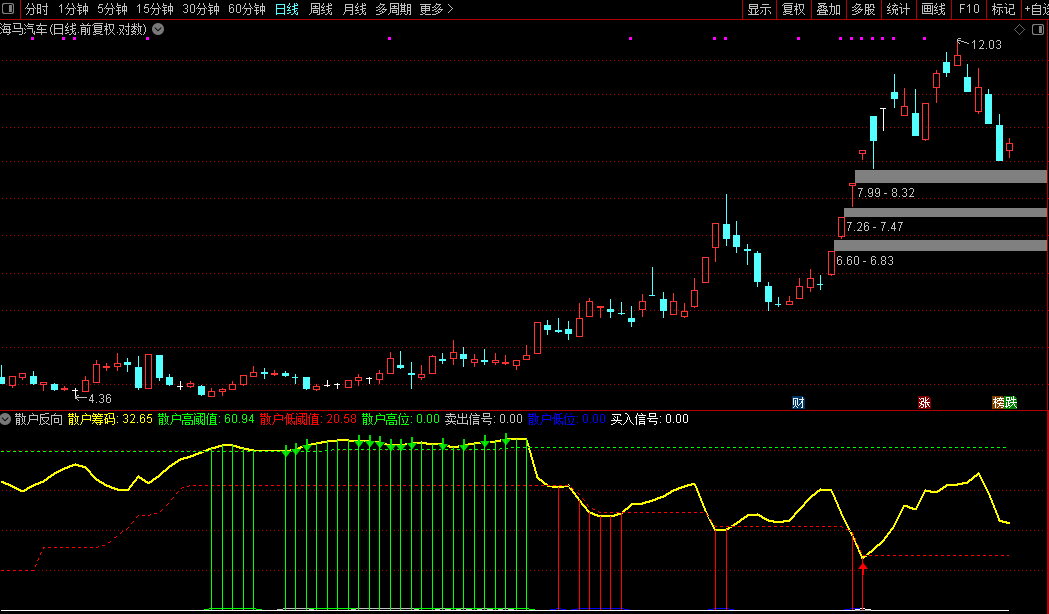 散户反向指标副图工具专为解决散户“一卖就涨一买就跌”的痛点设计,操作时可参考以下核心要素:黄色曲线(散户筹码线)实时反映散户在当前价格附近的持仓密集程度;绿色虚线为近60日散户筹码高位参考线(95%阈值),红色虚线为近60日散户筹码低位参考线(105%阈值)。当出现红色背景区域时,表明散户筹码处于极低水平,可视为潜在买点区域;绿色背景区域则显示散户筹码处于极高水平,对应潜在卖点区域。具体信号标识方面,↑图标代表满足“散户割肉+缩量阳线”条件,触发反向买入信号;↓图标代表满足“散户追高+滞涨或放量”条件,触发反向卖出信号。该指标无未来函数,保持原始数据真实性,适合短线交易者作为辅助参考工具。