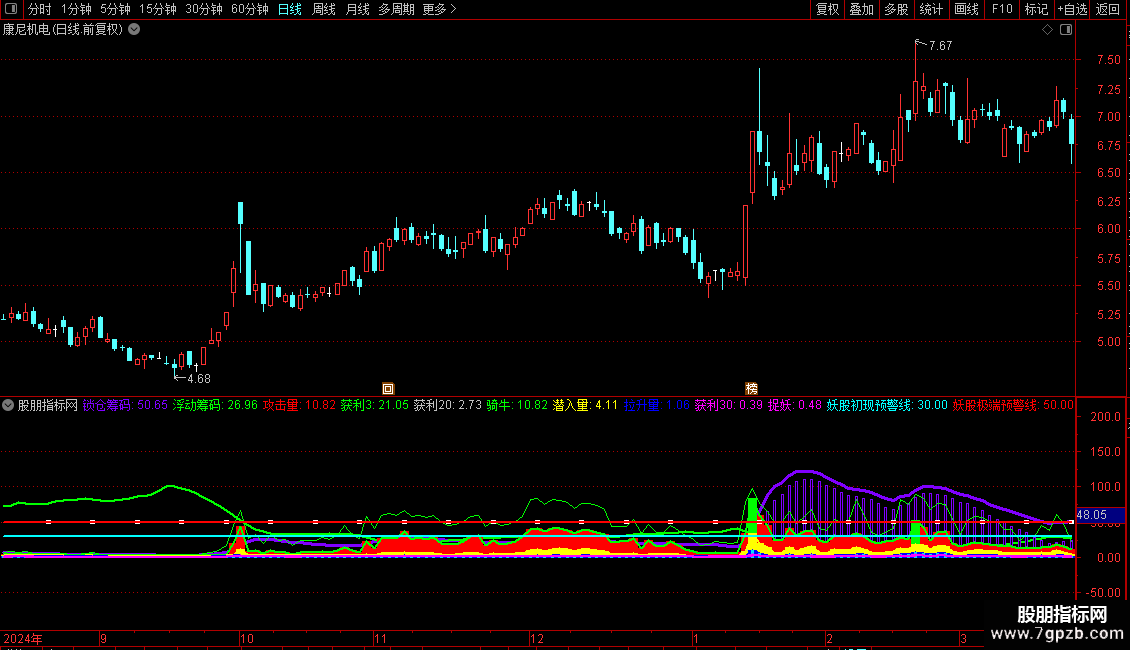 指标通过分析不同价位区间的持股比例变化,识别主力资金深度介入的股票。核心功能是监控"捉妖线"突破关键阈值来捕捉强势启动信号,并用筹码集中度判断锁仓力度。操作策略是当指标突破第一道预警线时关注,突破第二道预警线时视为强烈买入信号。
