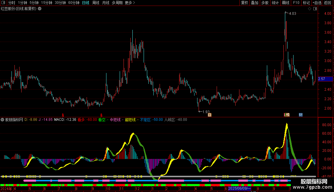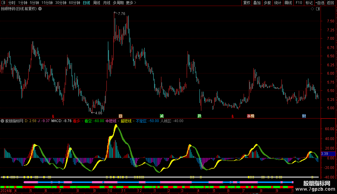 中短线:IF(J>D,-50,DRAWNULL),LINETHICK7,COLORCC66FF;