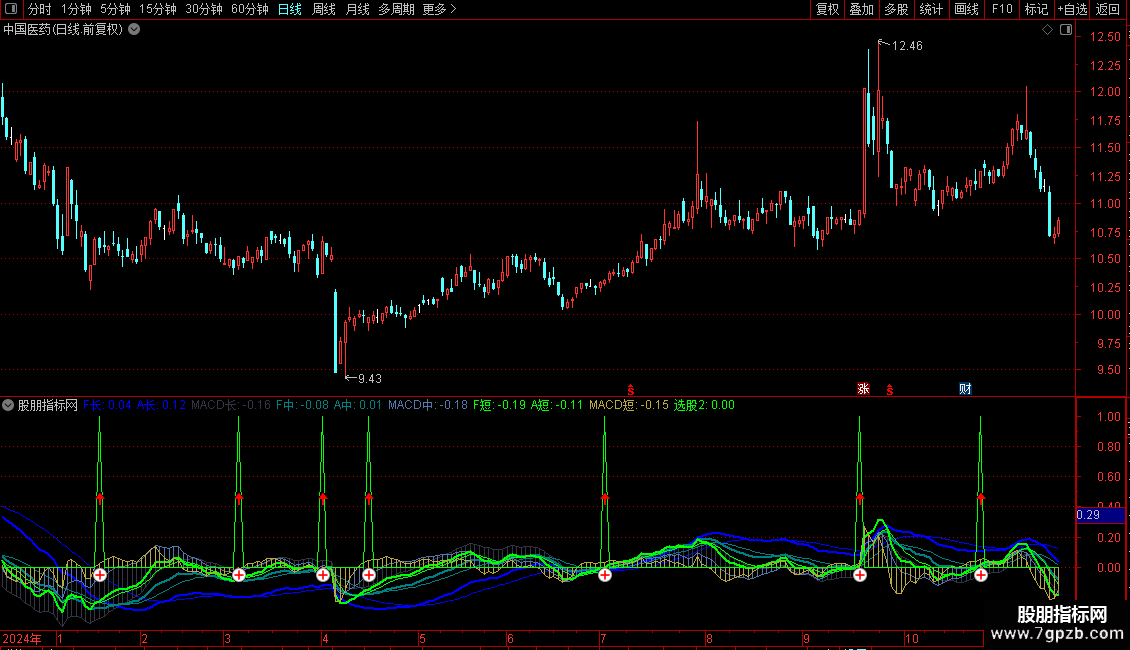 A中:EMA(F中,9),COLORLICYAN,LINETHICK1;