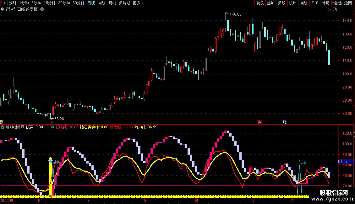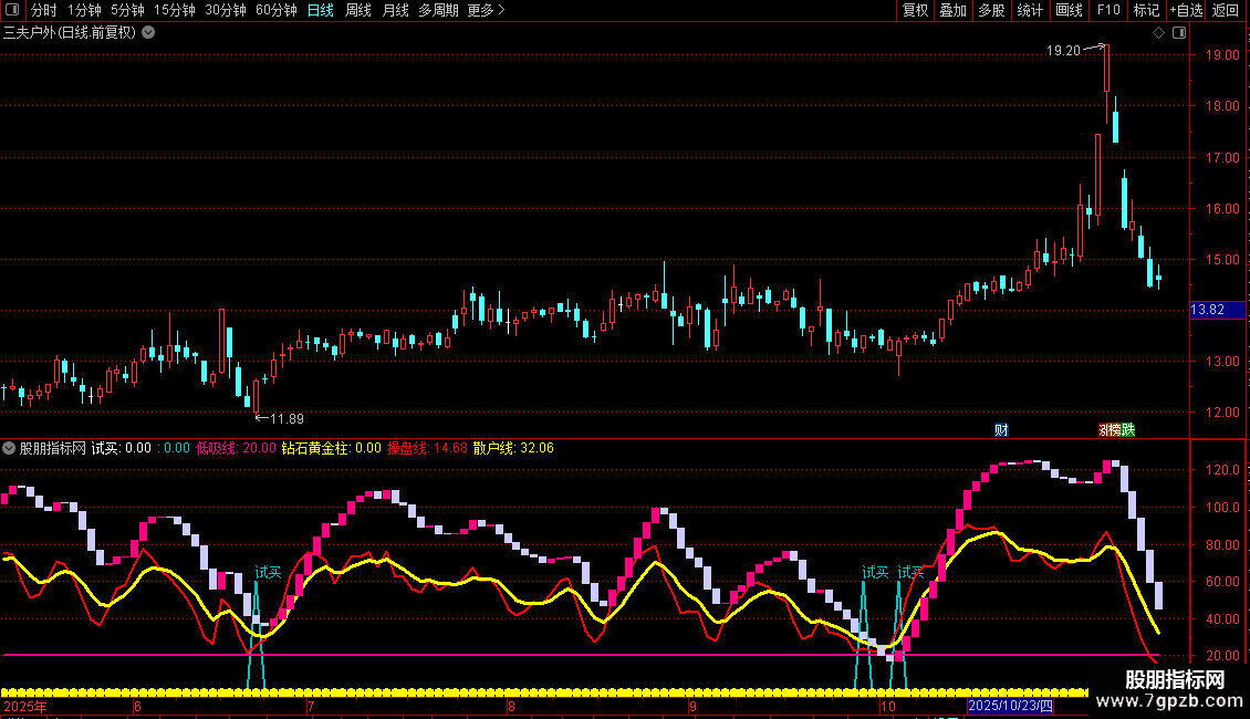 散户线:SMA(操盘线,3,1),LINETHICK3,COLORYELLOW;