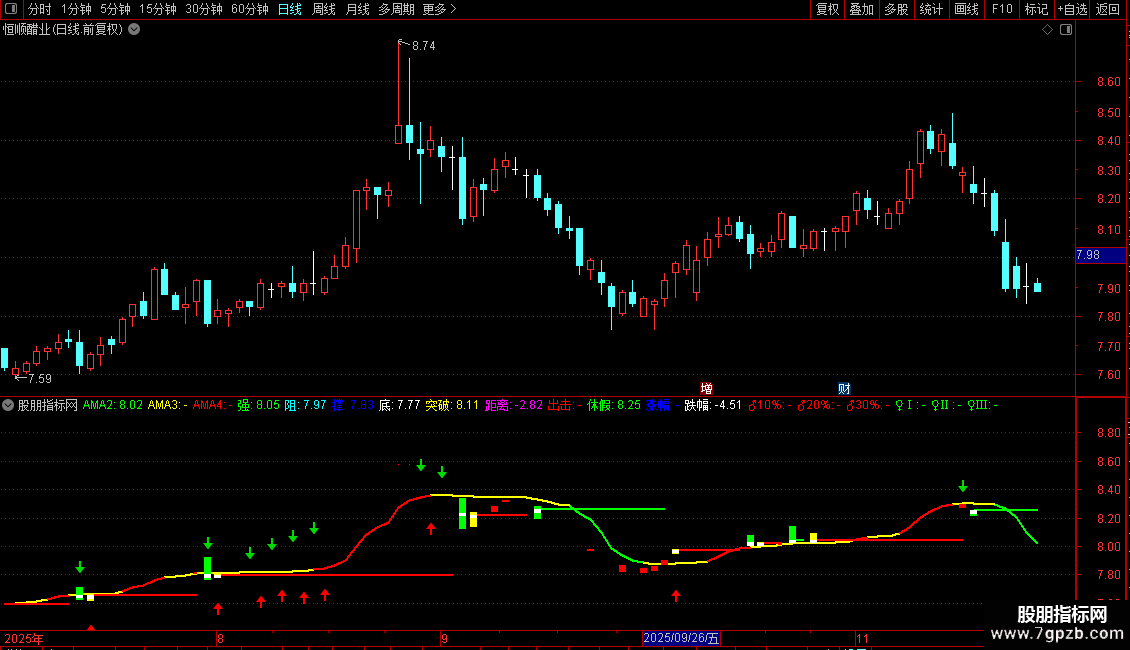 AMA2:EMA(DMA(CLOSE,CQ2),2),COLORGREEN,LINETHICK2;
