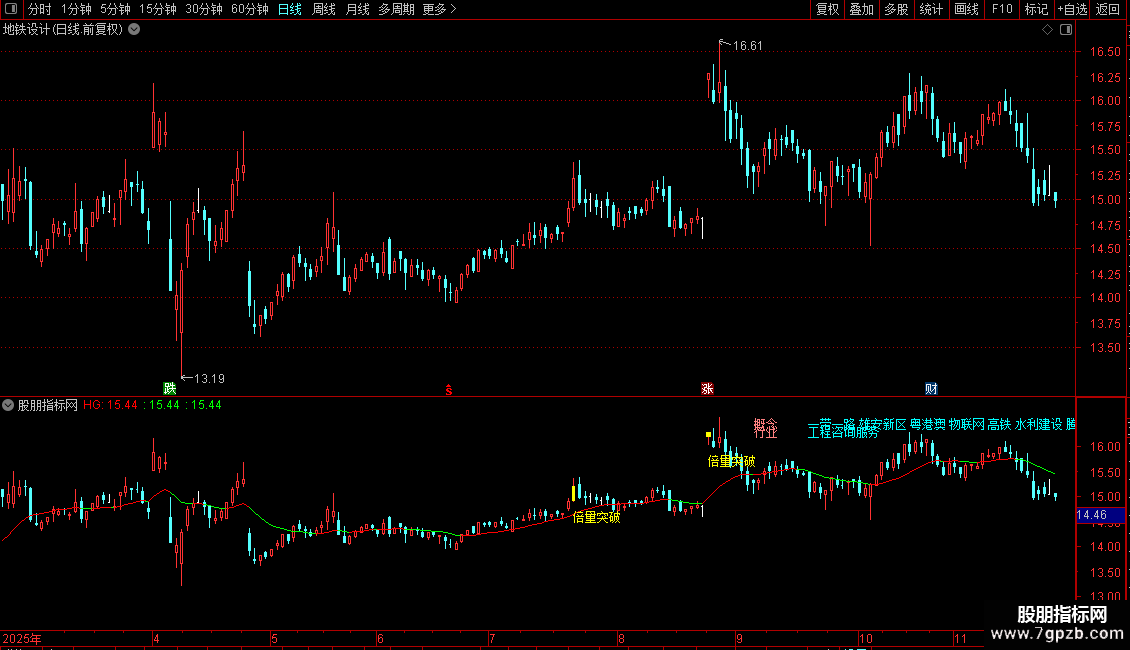 指标通过识别历史高点位置,结合成交量异动和价格突破行为,在K线图上标记买入信号点,并显示行业概念信息辅助决策。