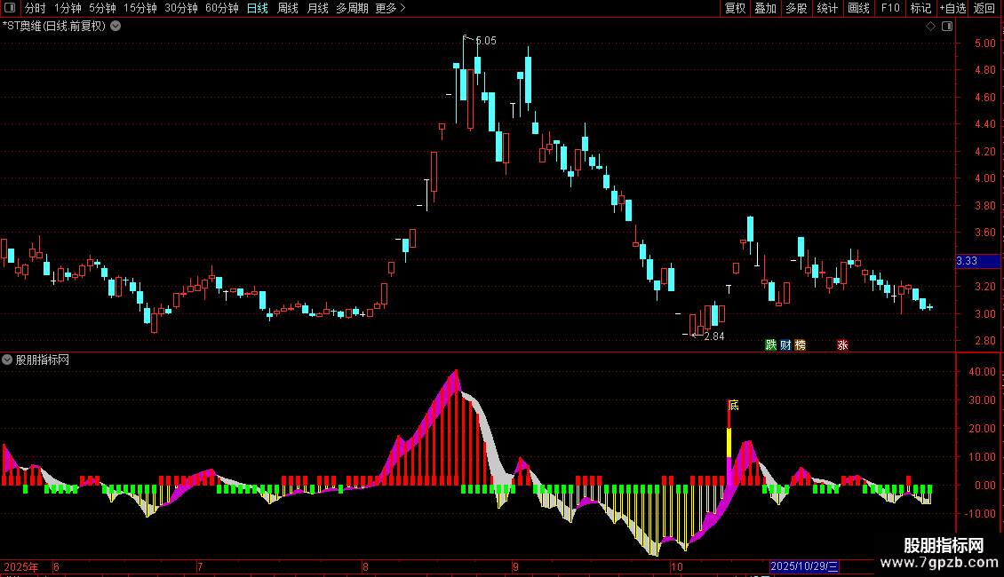 1.底部乖离指标是将价格趋势、成家量趋势和EMA选出底部乖离度高的信号,乖离度高说明底部确定性越高。副图中还包含其他辅助判断强弱的红绿柱判断。