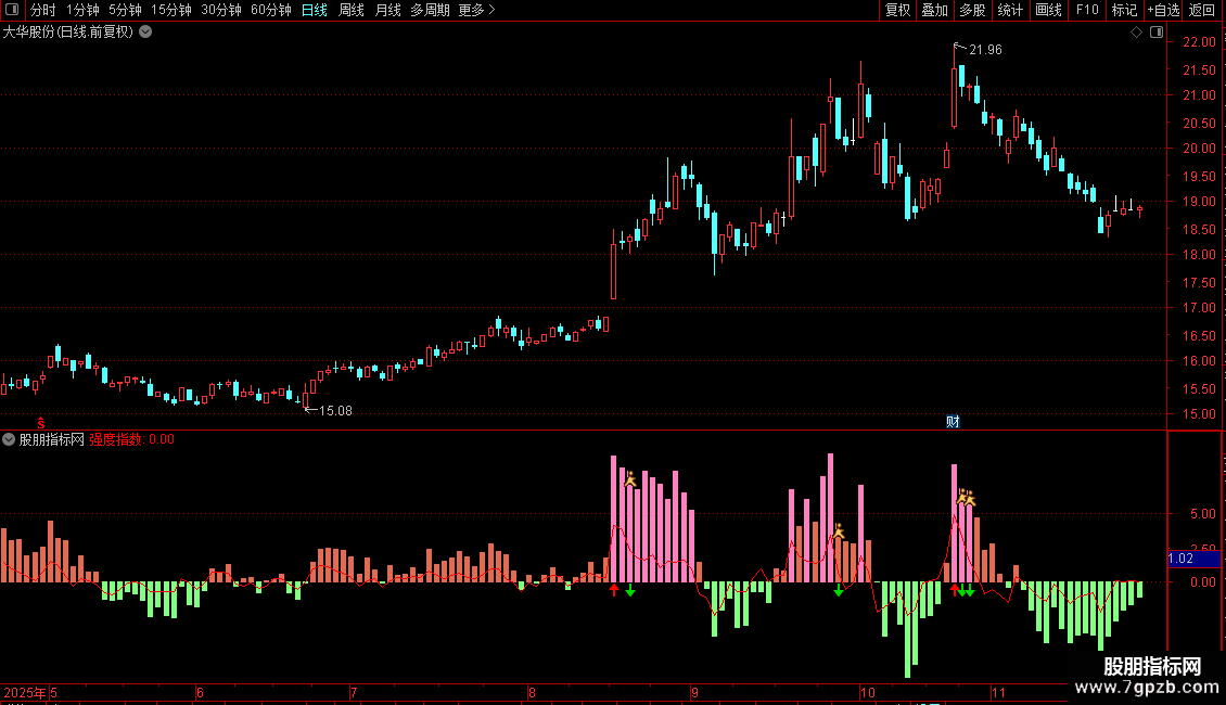 DRAWICON((REF(强度指数,1)-强度指数)>=1.5 AND 强度指数>0,VAR17,15);