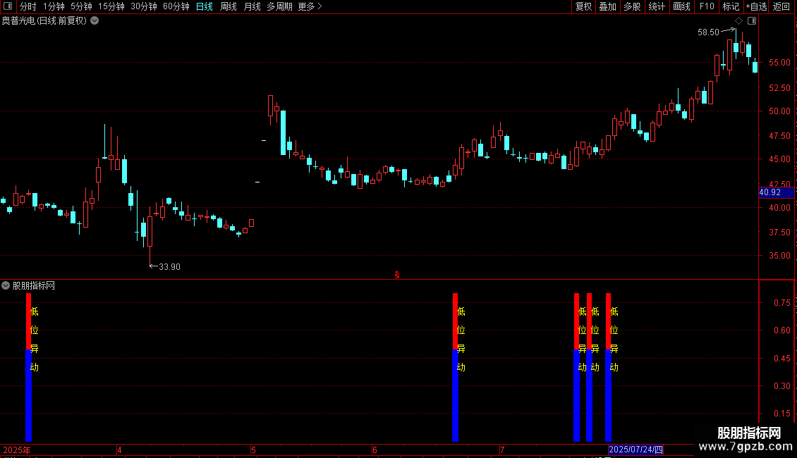 操作策略:当指标出现"低位异动"信号时,表明股票经过一段时间的低位整理后,多个技术指标同时转强,可考虑逢低关注。信号出现后配合其他分析工具确认趋势转变。