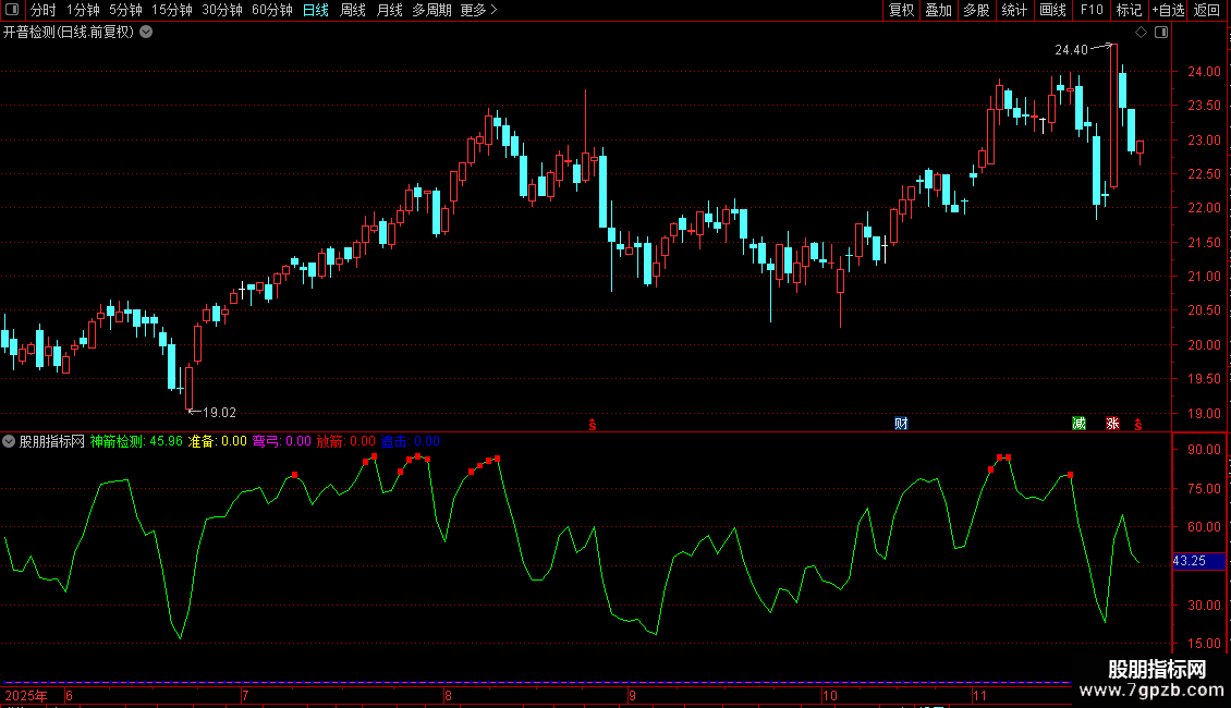 逢高派发: STICKLINE(神箭检测>80,神箭检测+1,神箭检测-1,1.5,0), COLORRED;