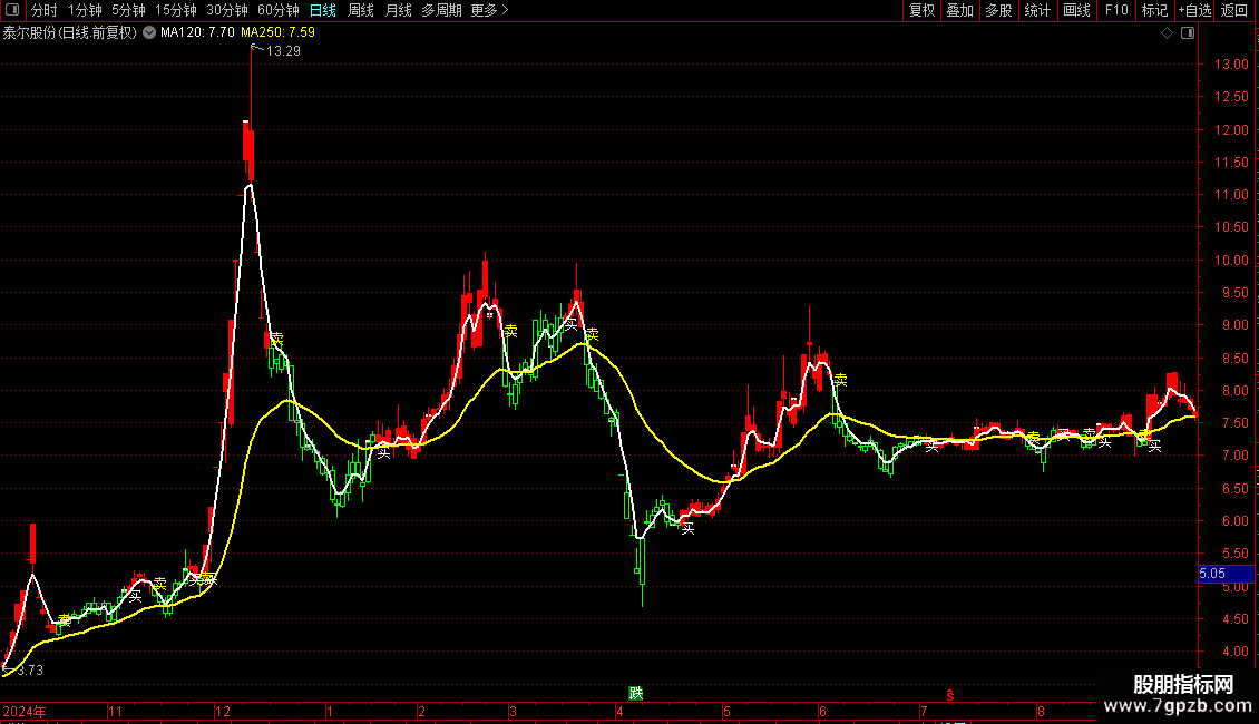 要点:适用于趋势明显的龙头强势股,震荡市需结合RSI(7/14日已内置)过滤假信号,建议配合成交量验证。主做右侧交易,避免抄底。