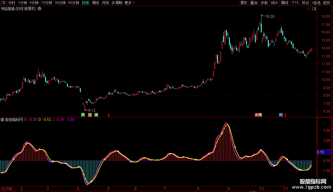 KDJ因其快速响应的特点而受到普遍应用,其指标设计因包含了最高价、最低价和收盘价,故从理论上来说比MACD携带更多信息,但其自身所蕴含的先天缺陷使其容易出现高位和低位钝化,并且KDJ自身频繁交叉易产生虚假交易信号,斯蒂芬超级KDJ从原理入手,有效消除了传统KDJ易高位钝化、交易信号频繁的缺陷,并将KDJ金叉的准确率提高了大约4%,更重要的是,斯蒂芬超级KDJ本身成为了一个正向盈利的策略。另外给出创业板4037点时的斯蒂芬KDJ的有效顶背离图形,供各位股友参考。