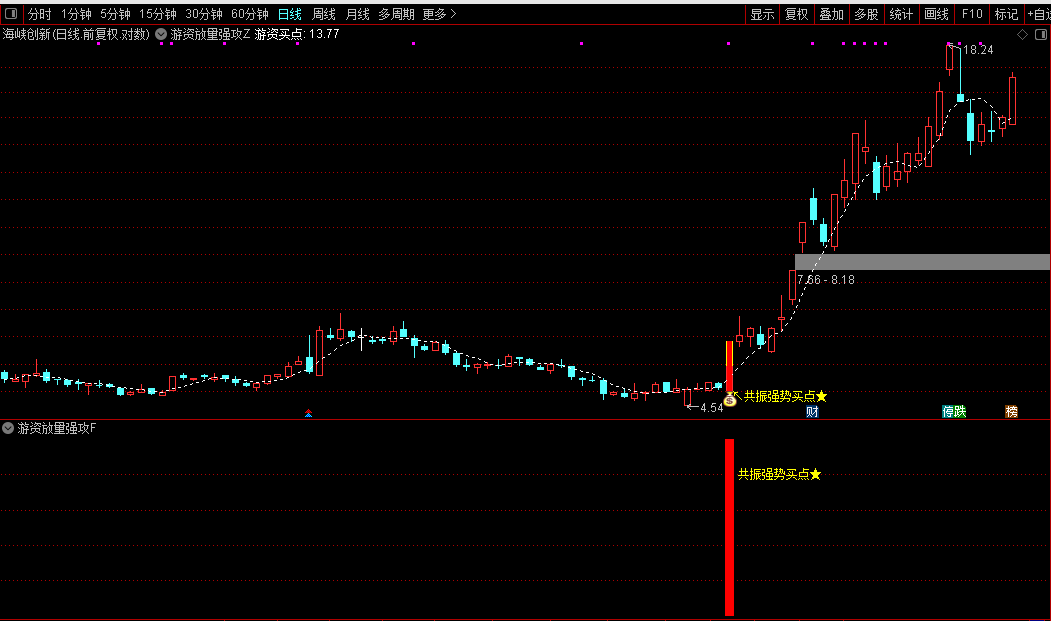 本指标是 “多条件强势选股 + 游资放量买点” 的共振可视化工具,核心功能是在个股 K 线主图中,精准标注同时满足 “原多维度强势条件” 与 “2 倍放量游资介入” 的共振买点,帮助投资者直观识别兼具基本面逻辑(强势形态)与资金面支撑(放量介入)的关键机会。