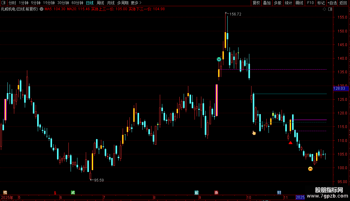 1. 量柱标记系统:自动标记20日及100日内高量柱、低量柱关键位,以紫色/青色柱体及图标清晰标注