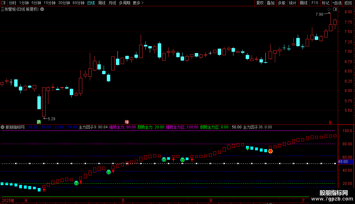 指标通过计算价格在特定周期内的相对位置来判断主力资金动向。核心功能是识别主力控盘状态转换的关键节点,当指标从弱势区突破至强势区时产生买入信号,从强势区回落至弱势区时提示风险。