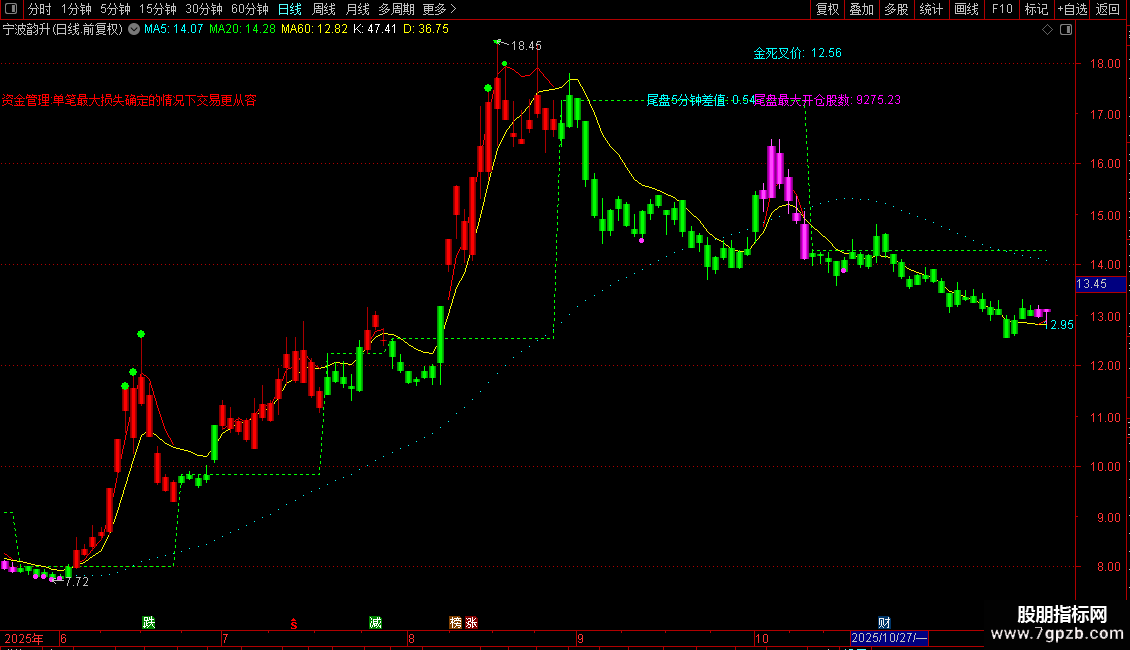 黄铢消失见顶:=IF(柱变向价>=DIF拐头价,DIF拐头价,DRAWNULL),COLORYELLOW,CIRCLEDOT,LINETHICK1;