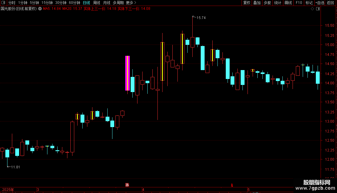 实体下三一价:MIN(OPEN,CLOSE)+ABS(OPEN-CLOSE)/3,NODRAW,COLORRED;