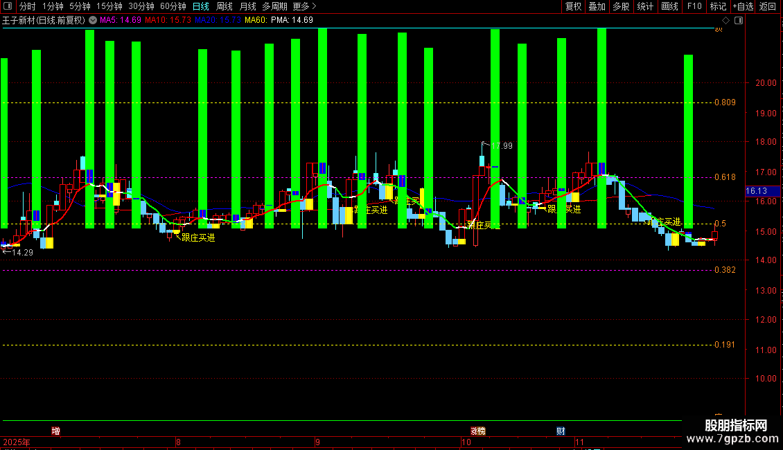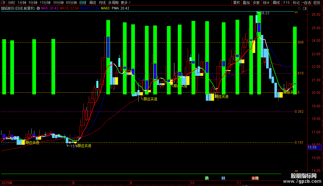 DRAWTEXT(FILTER(买=1,5),LOW-0.05,'↖跟庄买进'),COLORYELLOW;