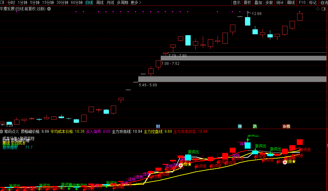 这是一个非常完整的三合一成本分布系统与游资监控模型,结合了成本分布、主力攻击系统和游资资金流向分析。
