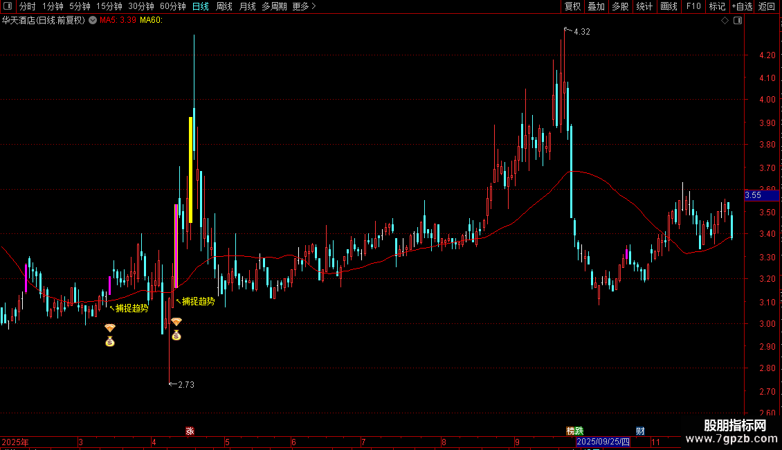 DRAWTEXT(VAR1 AND 捕捉线>REF(捕捉线,1) AND C>捕捉线,L*0.98,'↖捕捉趋势'),COLORYELLOW;