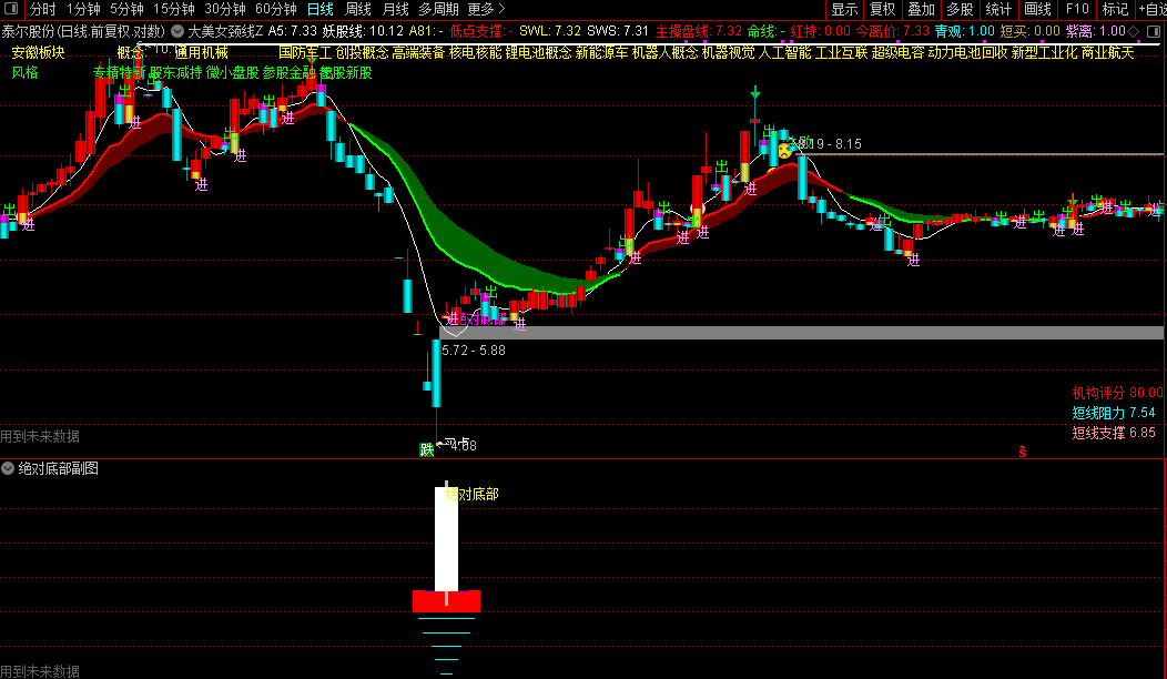 本指标为“大美女颈线突破”包括1主、2副和2选指标分析工具,主要用于识别个股关键颈线位置的突破信号,并辅助判断买卖时机。其核心功能包括:自动绘制不同周期的颈线及支撑压力线,当价格放量突破白色“妖股线”或黄色颈线时,会标记“妖股”或“突破颈线”提示,为趋势启动提供参考。同时,指标结合成交量、跌幅等条件,在特定回调位置捕捉“凹口淘金”等低吸机会,并设有“绝对底部”、“全军出击”等多元买点预警。此外,它还整合了短线支撑阻力位显示、机构评分、涨停统计等实用信息,帮助投资者综合把握股价强弱与结构,适用于趋势跟踪和突破交易的辅助决策。