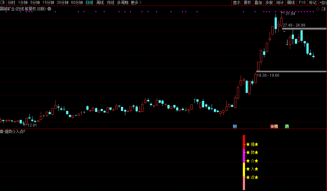 1. 副图应用:在副图区域直接观察“强势介入点”信号标记。当出现红色箭头时,表示符合策略条件,可结合K线位置研判买点。