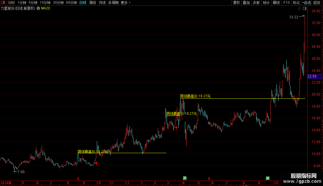 1、指标原理解析:股票涨停后,庄家常打压股价洗盘。大阴线会吓退不坚定投资者,庄家则低位吸筹。当股价突破该阴线最高价,即为分批建仓信号。