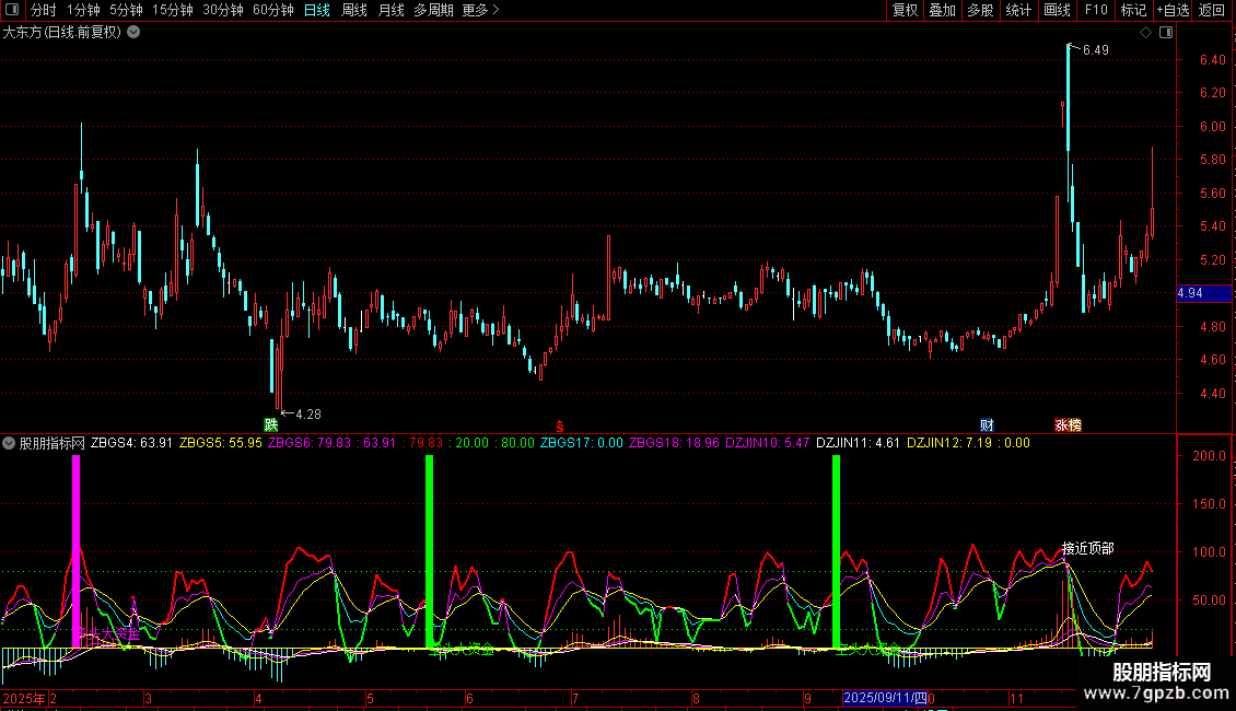 DRAWTEXT(DZJIN7=10 AND FILTER(DZJIN7=10,5),ZBGS6,'接近底部'),COLORYELLOW;