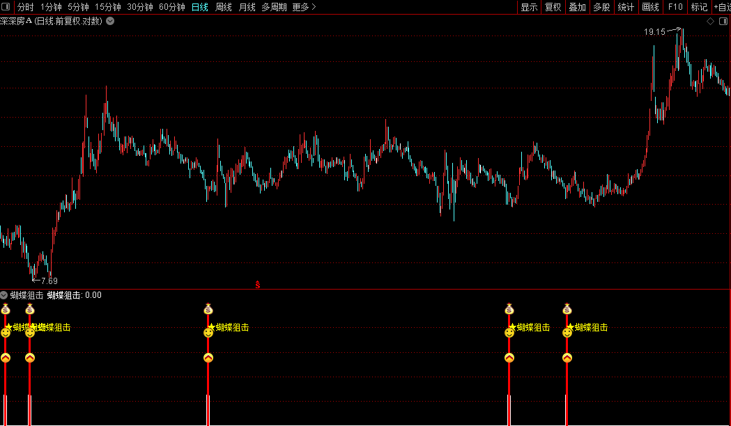 当副图区域出现粉色柱状信号线,并伴有黄色“★蝴蝶狙击”图标及文字标记时,即触发买入信号。该信号通常出现在股价经历短期调整、处于相对低位之际,提示市场短期动能有望转强。