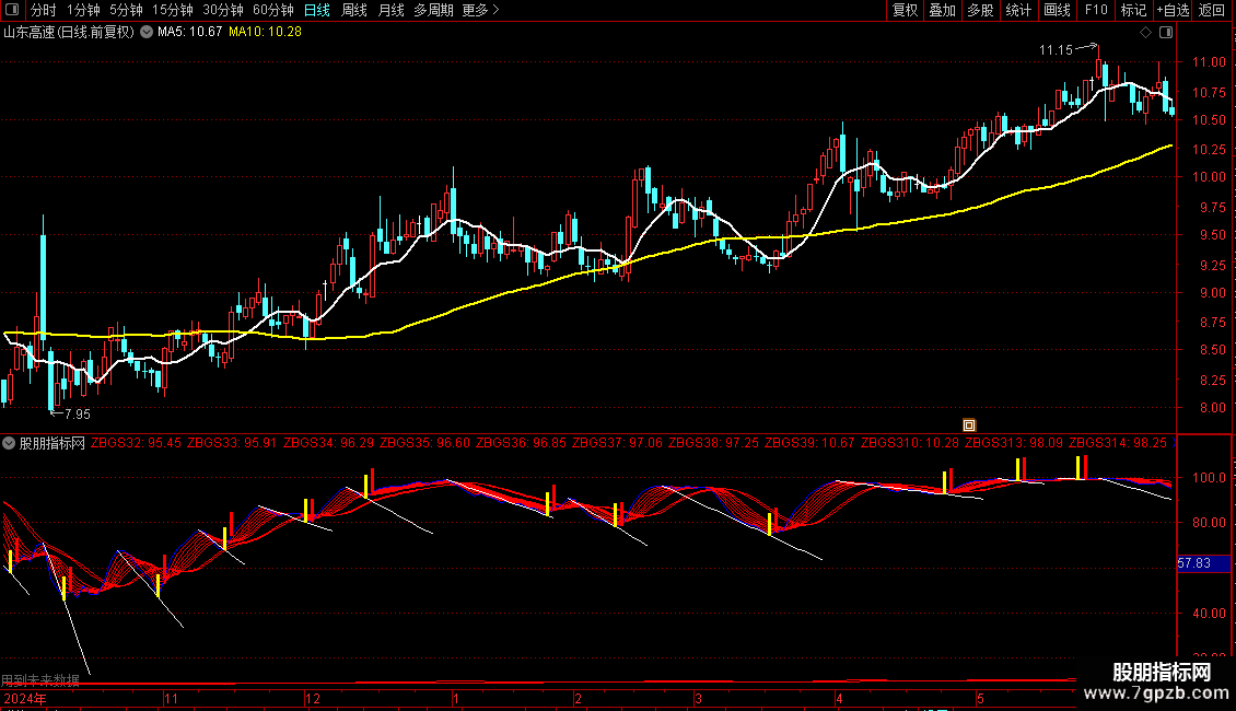3.主图白线上穿黄线金叉,K线高开站上金叉,副图多头趋势线全发散向上即共振买点