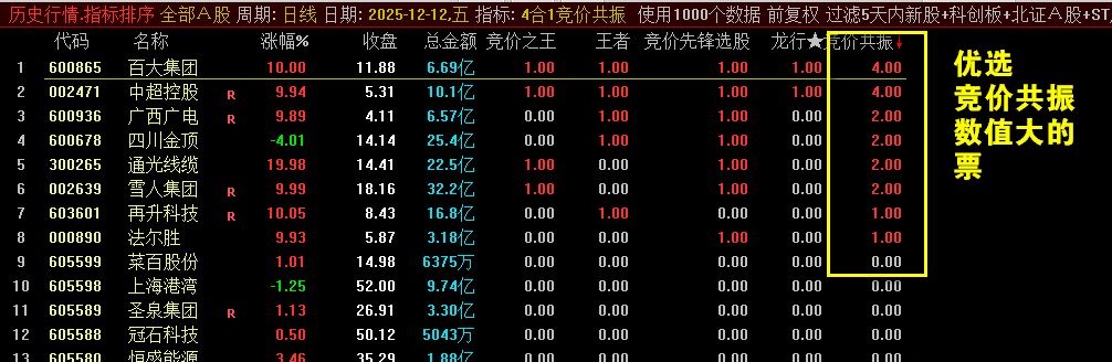 9:25后,排序,优选 “竞价共振” 数值大的票,也可以通过选股选出大于等于共振数3的票。