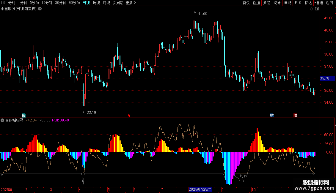 STICKLINE(MACD<0 AND MACD<REF(MACD,1),MACD,0,0.5,0),COLORFFFF00;
