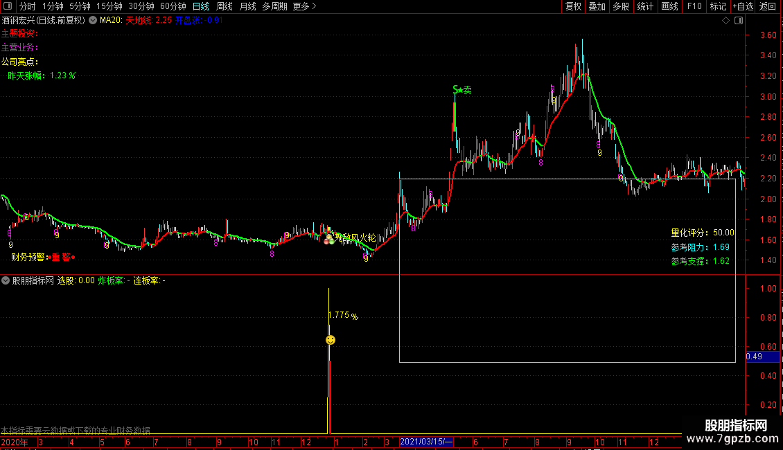 成绩:=(最高/买入-1)*100,COLORRED,NODRAW;STICKLINE(REF(选股,1) ,0,0.50,2,0),COLORGREEN;