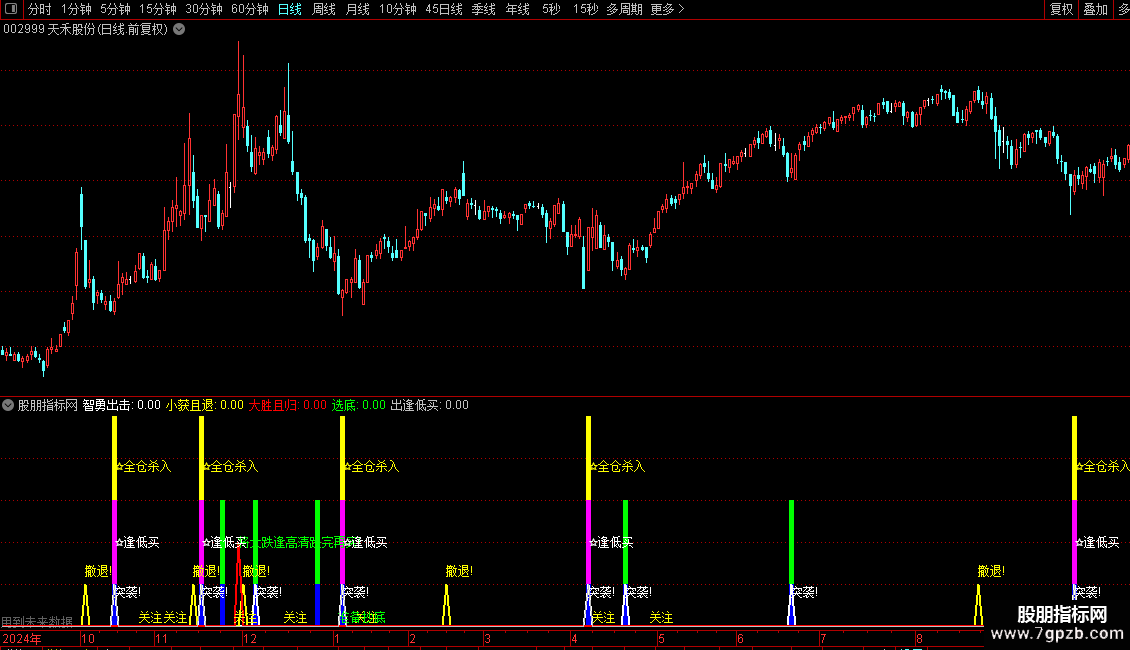 1. **买入信号**:出现“☆全仓杀入”(多周期ZIG共振金叉+下跌反转)、“突袭!”(短期趋势拐头向上)、“准备抄底”(底部拐点临近)或“☆逢低买”(ZIG金叉)时,可结合K线形态确认进场;