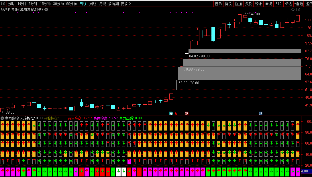 指标融合价格、成交量、筹码分布与多周期动量,综合判断市场运行状态。通过加权均价与均线偏离度识别资金成本变化,结合多个周期的随机指标和趋势线,分别评估趋势方向、动能强弱、上涨加速、资金流入及主力控盘程度。操作上,当多个维度同步发出积极信号(如趋势向上、动能增强、资金进场、控盘提升)时,视为较可靠买入时机;反之若出现背离或主力出货迹象,则提示谨慎或离场。界面以彩色条和图标直观展示各模块状态,便于快速决策。