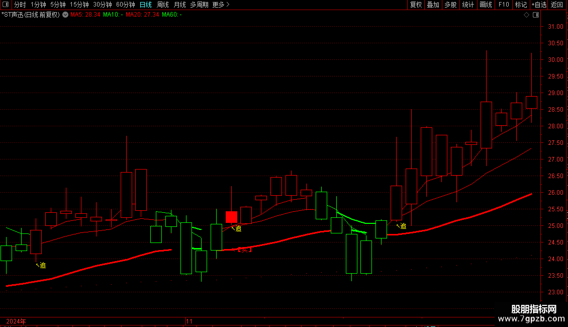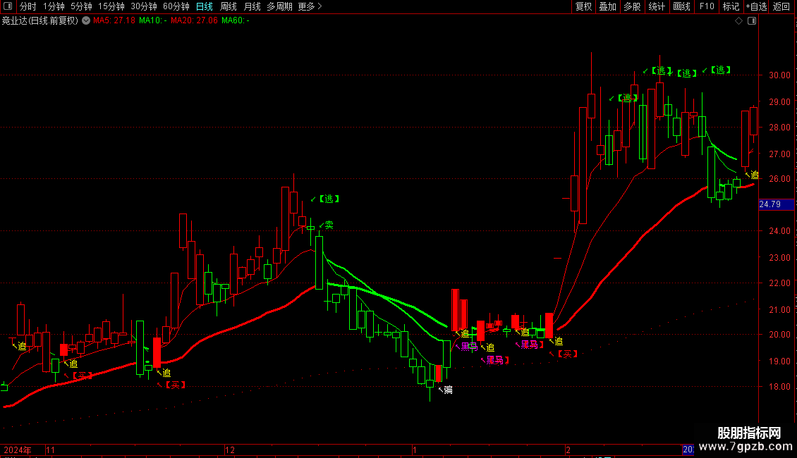 DRAWTEXT(CROSS(BF3,AF3) AND H>中中顶 AND H>中顶,H*1.03,'↙【逃】'),COLORGREEN;