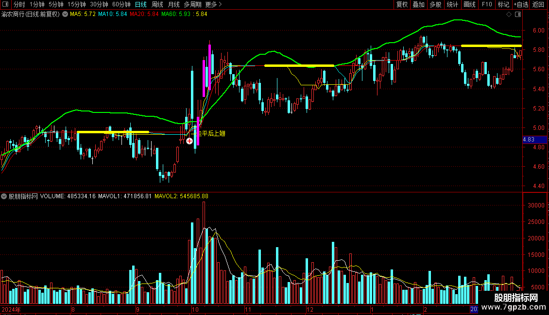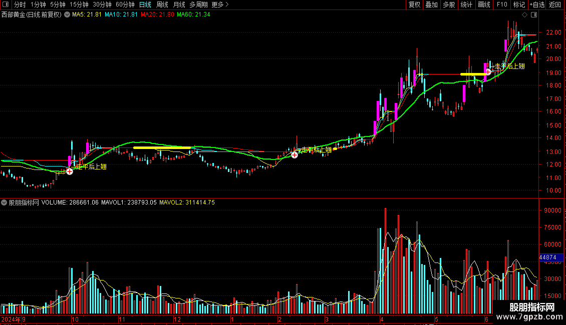 DRAWTEXT(CROSS(VAR4,VAR5) AND C>VAR7,LOW*1.01,' →走平后上翘'),COLORYELLOW;
