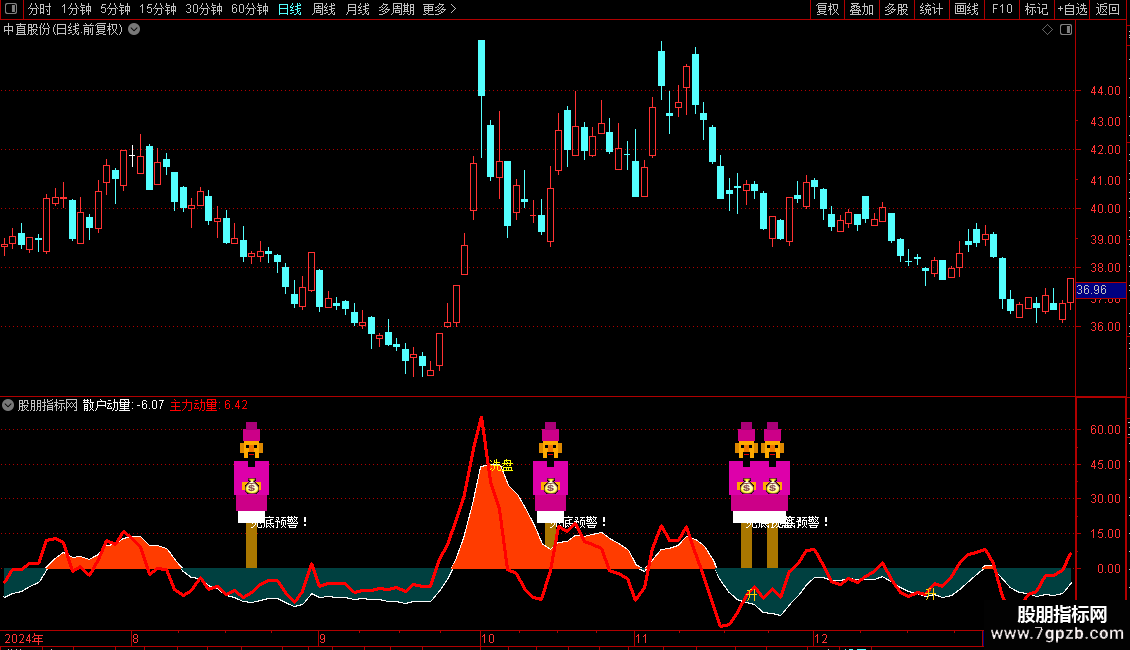 指标融合了随机指标(KDJ)变体、动量对比和相对强弱判断,用于捕捉潜在底部启动机会。通过监测短期价格在近期高低区间中的位置,结合长期与短期均线关系,识别“见底预警”信号。同时,利用散户与主力动量的背离与金叉,判断资金流向变化:当主力动量上穿散户动量且处于低位时,视为上涨启动;若叠加动量回升或极端低位,则触发买入提示。整体策略侧重于在市场情绪低迷、主力悄然介入时提前布局。